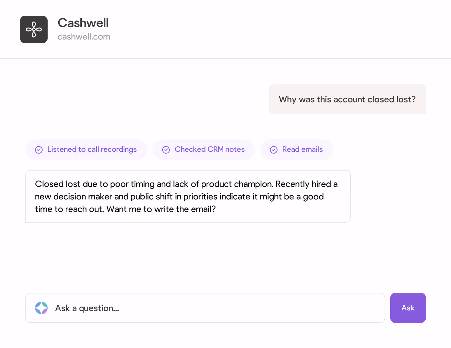 Instantly answer any question about the account, recent conversations, stakeholder sentiment, and more. Never be unprepared for a meeting or miss next steps.